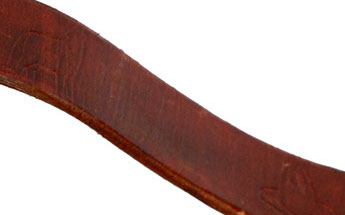 1 inch wide, 5 feet long, embossed with wolves and cowboy hats, brass clip closure, sturdy leather handle with brass rivets